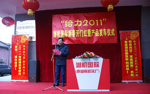 2011年2月10日農(nóng)歷初八,“給力2011”湖機(jī)國際新春開門紅暨產(chǎn)品發(fā)車儀式在劉年紅董事長的新年致詞中開始了。